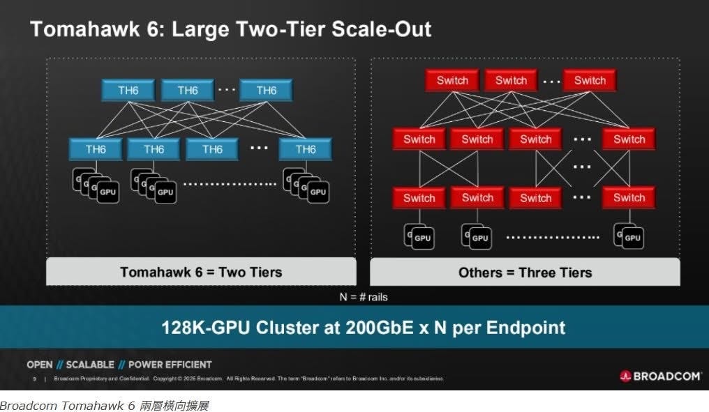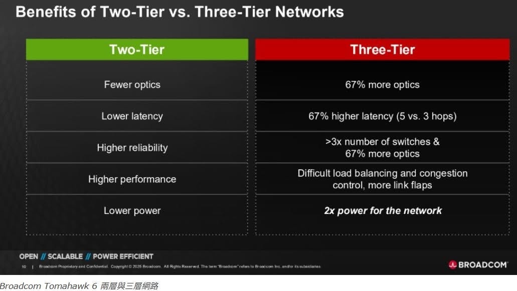 Tomahawk 6 的 102.4Tbps 超高頻寬,帶來一個革命性的改變:它能夠將部署超過 10 萬個 GPU 的大型 AI 叢集所需的網路層數,從三層壓縮到兩層(2-Tier)。